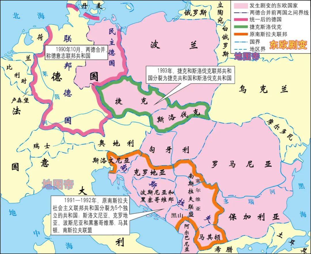 欧洲国家总数从33个增加到44个,苏联一分为十五,其中欧洲部分解体出俄罗斯、乌克兰、白俄罗斯、摩尔多瓦、波罗的海三国;捷克斯洛伐克解体为捷克、斯洛伐克;南斯拉夫解体成塞尔维亚、黑山、斯洛文尼亚、克罗地亚、波黑、马其顿;东德和西德合并。