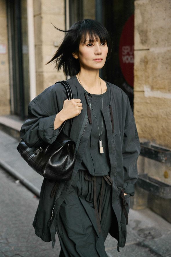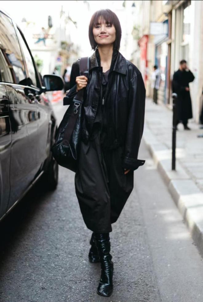 下身是一款黑色阔腿裤,只是由于脚上配了一双皮靴,所以将裤腿塞进靴筒里。总的来说,整体造型将舒适度、高级感拿捏得死死的。