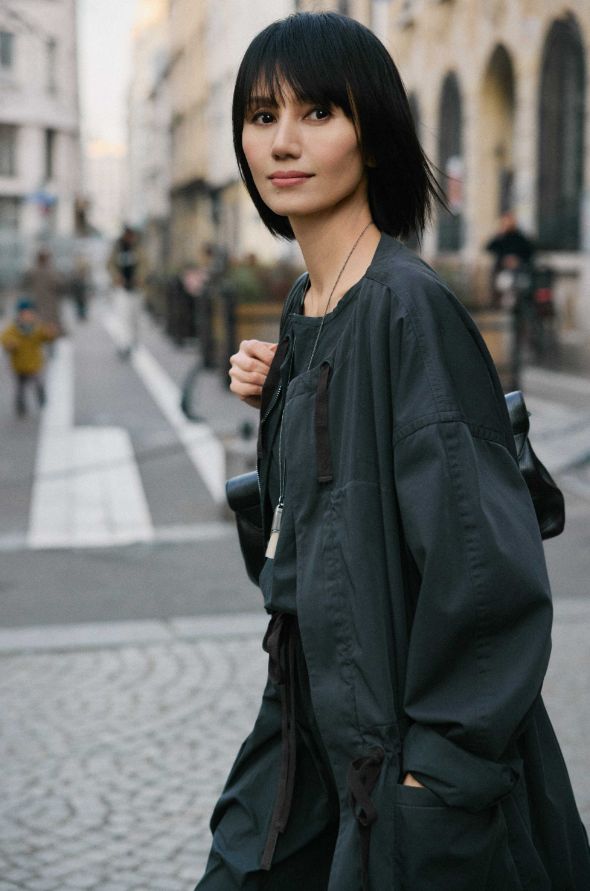 先来看看外套,散发出西装的正式感,再加上短发,让人不禁觉得严肃十足。这款外套有微弱的落肩袖设计,加上肩膀、衣袖松量多,所以很容易就隐藏宽肩这个小瑕疵。翻领设计自带干练利落之感,关键是此设计快延伸至衣摆,一眼瞅过去就层次感爆棚,任谁看了都想多看几眼。
