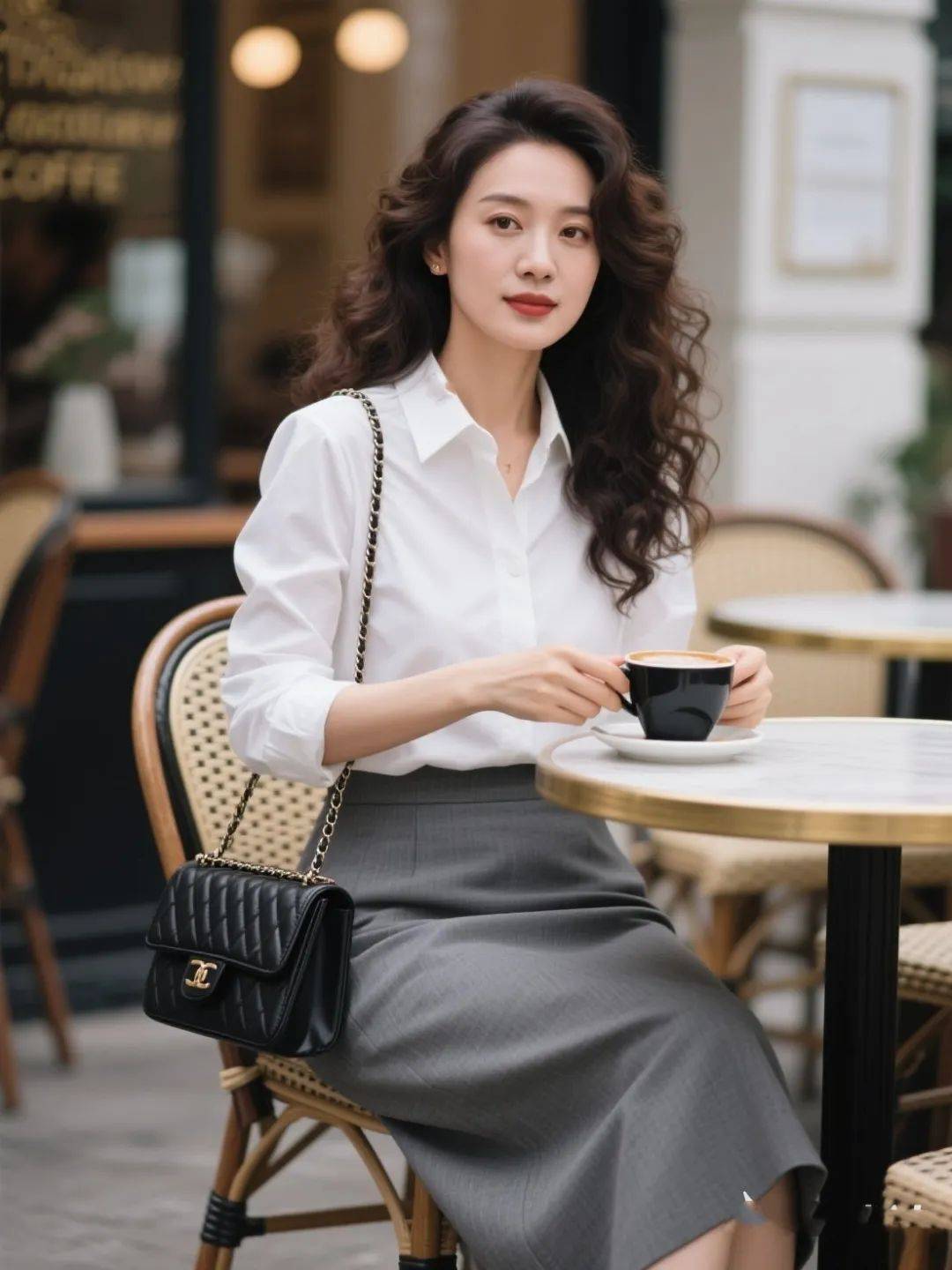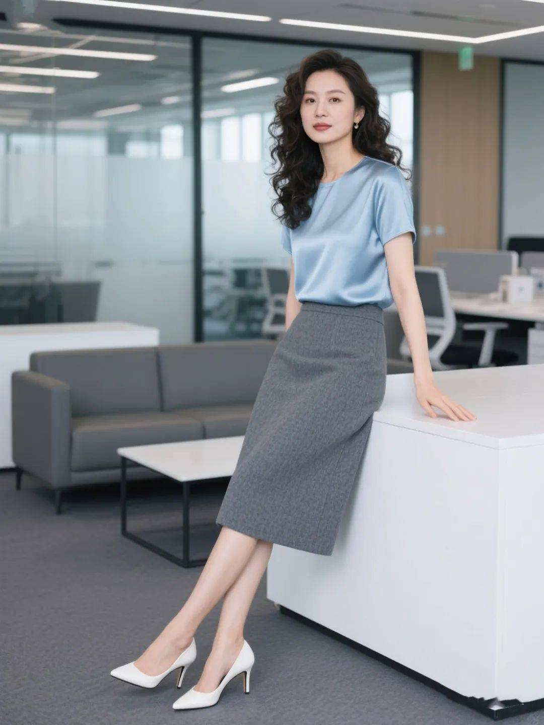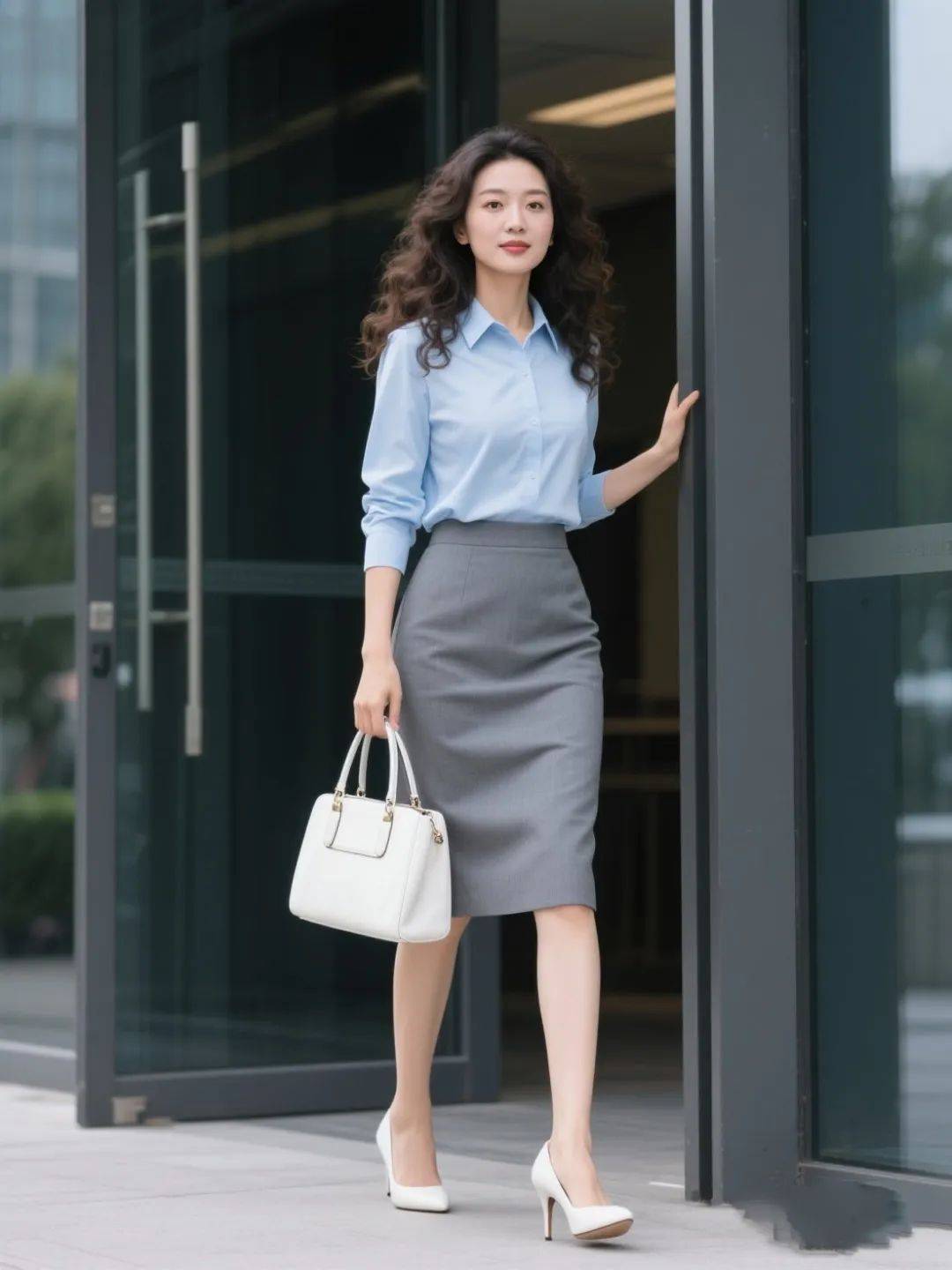 蓝色衬衫自带轻松自在的气场,搭配灰色半裙,女性的帅气魅力彻底释放!走路带风,自由不羁的洒脱气质拿捏得死死的~配上白色高跟鞋,不管是职场拼杀还是街头漫步,都像自带 “时尚 BGM”,又帅又美,回头率爆表!