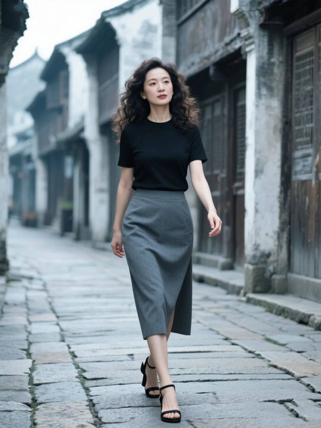 黑色针织 T 恤自带性感与独立自信的魅力,和灰色半裙一搭,每一步都像在跳优雅的旋律,让人忍不住陶醉~把下摆塞腰里,配上黑色高跟鞋,大女人的落落大方和休闲感完美融合,职场通勤、约会晚宴穿都超合适,走路带风,气场直接拉满!