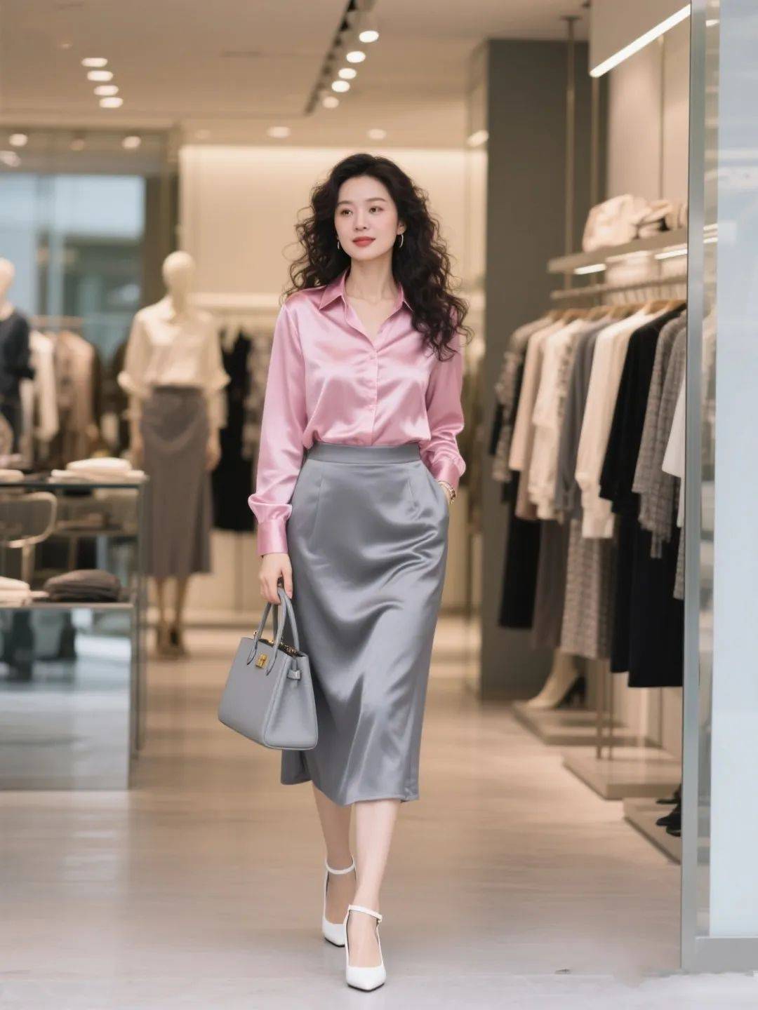 粉色真丝衬衫一上身,随性自然的好比例轻松塑造,潇洒利落的自信感扑面而来~搭配灰色半裙,无形中透着自信独立,从容不迫的状态直接拉满!踩一双白色细带凉鞋,飒爽个性藏都藏不住,约会、聚会穿,妥妥的 “气质女王” 人设。