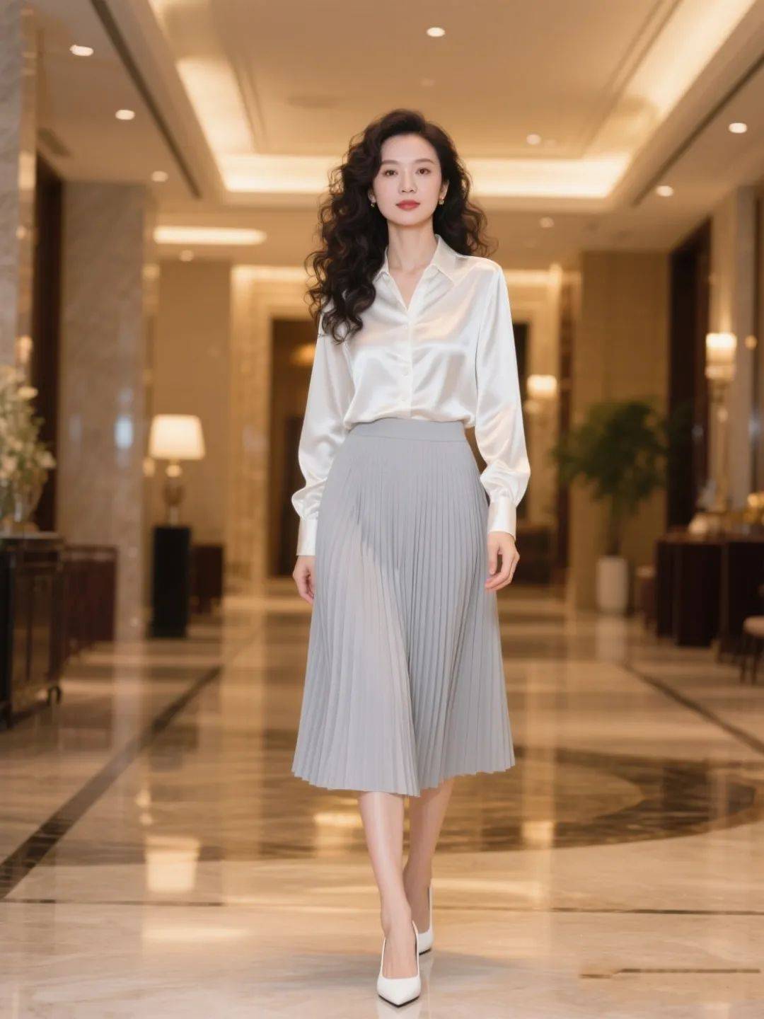 白色真丝衬衫自带时髦优雅滤镜,搭配灰色百褶半裙,高级又显瘦的气势瞬间释放!独特质感谁穿谁时髦,配上白色高跟鞋,刚柔并济的感觉拿捏,低调中藏着奢华,出席稍微正式的场合,这么穿准能惊艳全场~