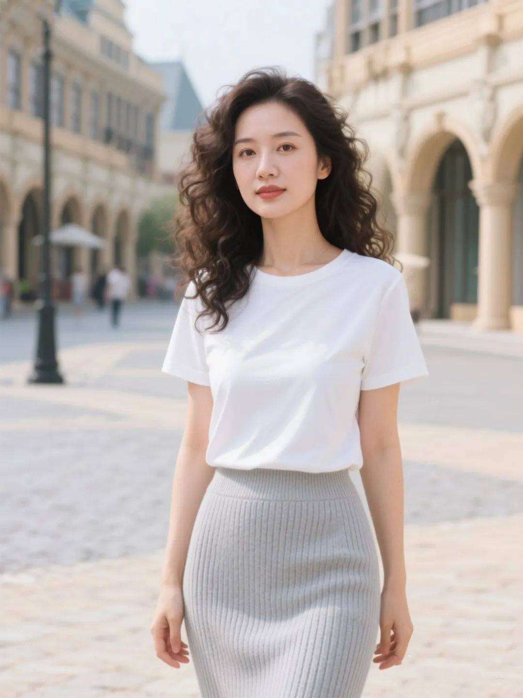 白色 T 恤的经典气场,搭配灰色针织半裙,夏日独特气质轻松塑造!把下摆塞腰里,为酷热夏日添一抹灵动与潇洒,不管是逛夜市还是看展,简约又有范儿,气场这块稳稳拿捏,谁看了都得说一句 “会穿”~