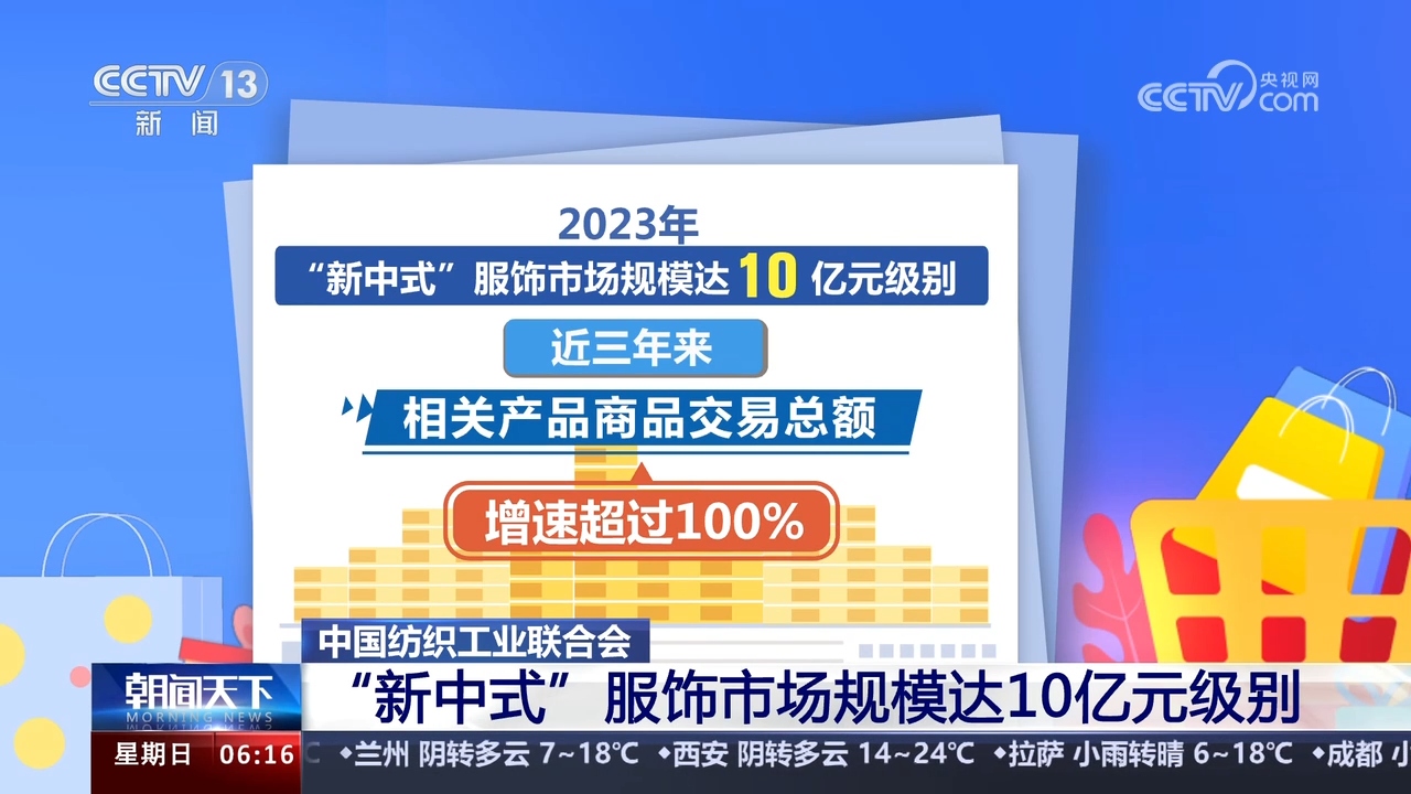中国纺织工业联合会数据显示,2023年“新中式”服饰市场规模达10亿元级别,近三年来,相关产品商品交易总额增速超过100%。今年1月以来,在互联网销售平台上“新中式”“宋锦”的搜索量环比分别增长近6倍和近20倍。
