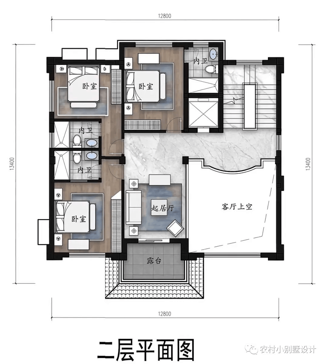 下面是设计参数:开间进深为12.8米×12.4米,占地面积158.72平方米,建筑面积约412平,砖混结构,造价区间50-80万。(仅供参考)