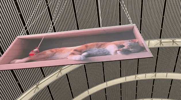 这里也是洲明独创虚拟IP“大橘”的新家。屏幕中,憨态可掬的橘猫正追逐着玩具,尾巴轻扫,玩具仿佛要跃出屏幕......裸眼3D的视觉效果逼真灵动,希望这只“大橘”能让许多赶路的旅客会心一笑,卸下路途的疲惫。
