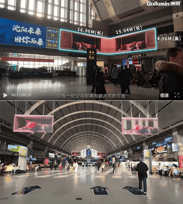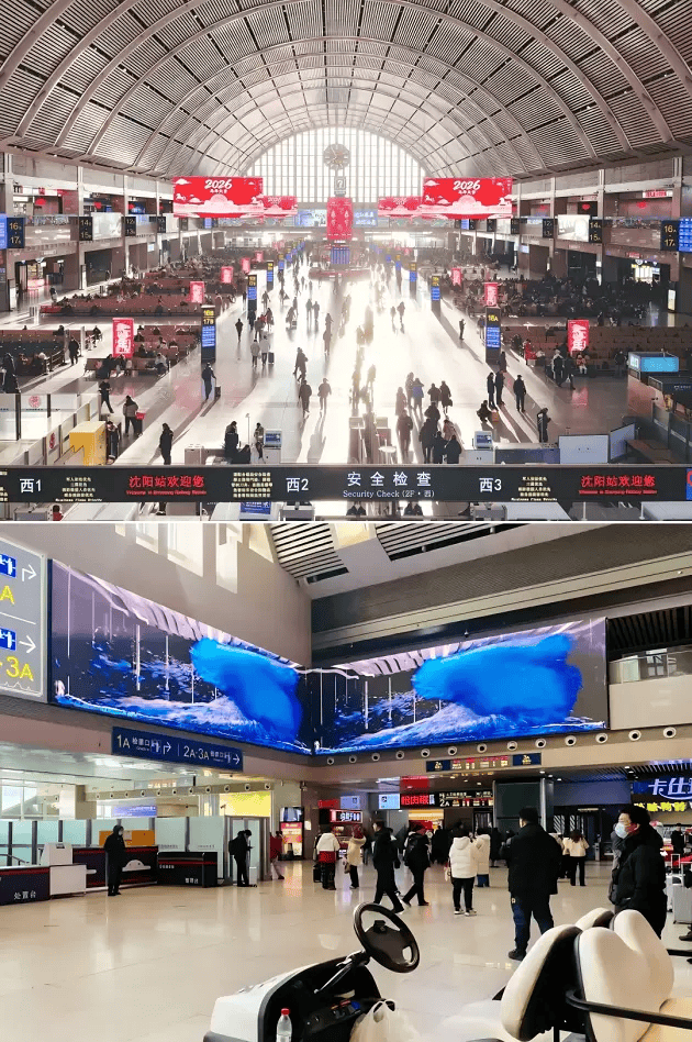 在熙攘的人流与温暖的秩序中,焕新后的沈阳站候车大厅精彩亮相——洲明科技以Uslim S2双面屏、裸眼3D显示解决方案,为这座东北枢纽站穿上“新衣”。