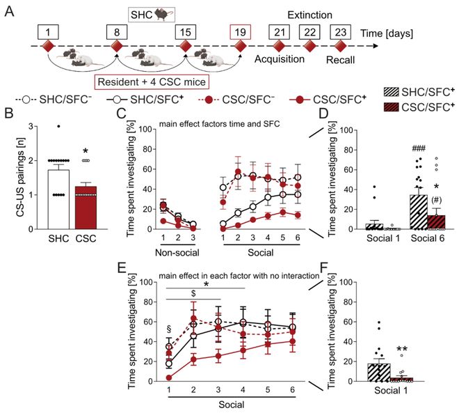与标准单笼饲养(SHC)小鼠相比,CSC小鼠的肾上腺和脾脏相对重量增加。在SHC/SFC+小鼠中,社交恐惧获得后出现了社交回避行为。具体表现为在获得阶段,经历1到2次电击后小鼠对社交刺激的进一步接触减少;在社交恐惧消退训练期间,对前三个同类个体的社交探究时间明显低于未经历恐惧条件化的SHC/SFC–组。SHC/SFC+小鼠在随后的6次社交刺激暴露过程中成功且持久地消除了社交恐惧。在SFC之前经历CSC暴露会影响社交恐惧的获得和消退。在获得阶段,与SHC小鼠相比,CSC小鼠仅需更少次数的电击即可引发社交恐惧。总体而言,SHC/SFC–和CSC/SFC–小鼠对社交刺激的探究时间没有差异。与各自未经历恐惧条件化的对照组相比,SHC/SFC+和CSC/SFC+小鼠在面对前三个社交刺激时的社交探究水平均显著降低,表明产生了社交恐惧。SHC/SFC+小鼠在经历3次社交刺激后恐惧成功消退,后续探究时间与对照组无异;而CSC/SFC+小鼠的社交恐惧消退受损,在所有社交刺激下接触时间均更短且持续回避。尽管两组初始恐惧反应相似,但仅SHC组能克服恐惧,CSC组在最后一次刺激及后续回忆测试中仍表现出社交回避,表明慢性应激损害了社交恐惧的消退与长期恢复。