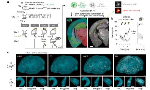 FC 后 1 天(Day 5),将小鼠再次放入 CtxA(无电击),停留 15 分钟,通过情境线索唤起恐惧记忆,进一步激活星形胶质细胞 Fos 表达;设置对照组(NoFC:无电击;NoFR:FC 后不进行回忆)排除非特异性激活。